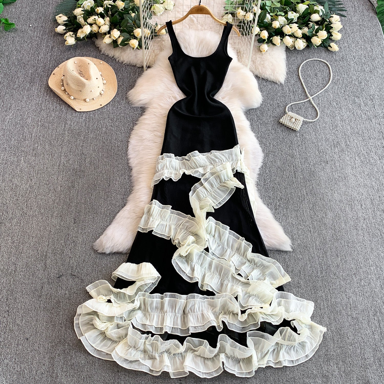 Turn heads in this stunning ruffled patchwork maxi dress. Designed with a slim-fit silhouette and layered ruffle accents, it combines elegance with a sweet, feminine vibe. The sleeveless knit tank style makes it perfect for vacations, evening gatherings, or special occasions. Crafted with comfort in mind, this unique piece is a must-have for women who love sophisticated fashion with a playful twist.